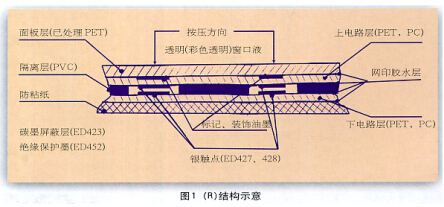 (R) 結構薄膜開關是由面板層 隔離層 電路層組成 它們選用了PET,PC,PVC等各種不同性質的軟性薄膜 就是在這些片材上通過網版印刷在面板上印刷彩色指示性油墨 在電路層上印刷導電線路和絕緣油墨等 再進行組合就成了薄膜開關.